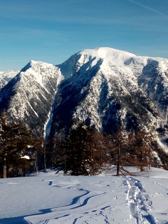 Im Spätherbst konnte ich die unmarkierte Wanderung von der Gosaumühle bis zum Kalmberg gehen. Dies war nicht so schwierig, weil man immer wieder deutliche Steigspuren findet. Im Winter gestaltet sich das etwas komplizierter, denn außer Steigspuren von Rehen und Hasen, sieht man nicht viel mehr. Dennoch ging es gut voran und nach knapp 2 Stunden, stand ich vor der Gipfelflanke vom Löckerkogel. An eine Besteigung war von Anfang an nicht zu denken, denn bereits vom Tal sah man die Wechten und die Spannung im Schnee. Es machte mich aber keineswegs traurig, weil erstens war der Anstieg sicher gelungen, zweitens war die Aussicht nicht minder schön und drittens war eine schnelle und skitourentaugliche Route gefunden worden. Einziger Minuspunkt war, dass die ausgesprochen große Strahlung der Sonne, denn Schnee in eine schwere Pampe verwandelt haben. Mit ein paar Umwegen fand ich aber noch ein paar schöne Pulverschwünge.