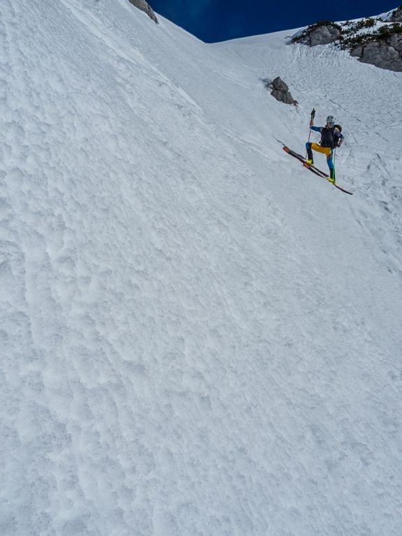 Beim zweiten Anstieg, klinken wir uns in die "Autobahn" zum Strichkogel ein und erreichen relativ schnell die östliche Strichkogelrinne, wo wir einiges an Pulverschnee vorfinden und das Weitkar erreichen. Nachdem Erkunden auch Spaß machen soll, entschließen wir uns nicht den kürzesten Weg zu gehen, sondern jenen, wo wir am meisten Pulverschnee finden. Für die Gosauumrundung selbst, wissen wir beide, dass dieser Anstieg zu viel sein würde.