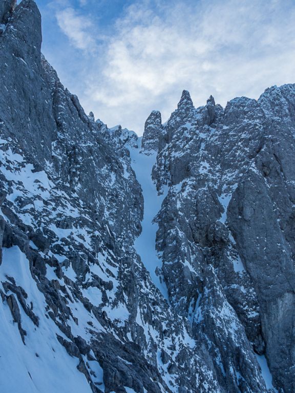 Es war ein guter Tag, denn nun haben wir eine Route, welche für uns passt und auch dem Gosaukamm würdig ist. Es soll nur ein Gipfel bestiegen werden und Dieser durch eine logische, aber dennoch nicht zu unterschätzende Rinne. Beide beschließen wir, diese Rinne vor unserer Umrundung noch zu begehen, um auch wirklich alles zu wissen, was uns dort erwartet.