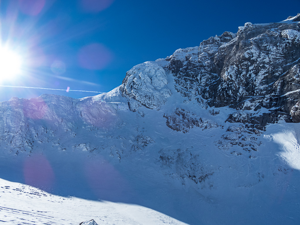 Es brauchte ein paar Minuten, bis ich diese Gegebenheit akzeptieren konnte und mich weiter zur Niederen Windlucke machte, um noch den Anstieg auf den Torstein zu erkunden. Vielleicht wären dort die Bedingungen besser, doch auch hier war ca. bei der Hälfte des Anstieges schluss. Die Sonne hatte sämtliches Eis in der Felswand in Wasser verwandelt. Dementsprechend brüchig war es dort. Eine mächtige Wechte versperrte mir den Weg in die Südrampe, welche den Normalanstieg im Sommer darstellt.