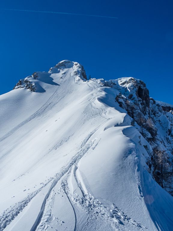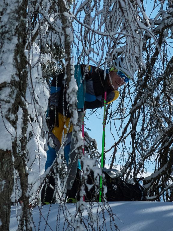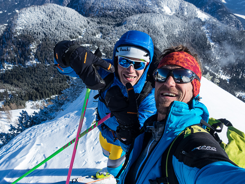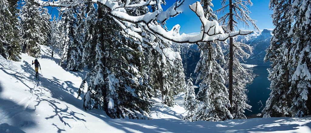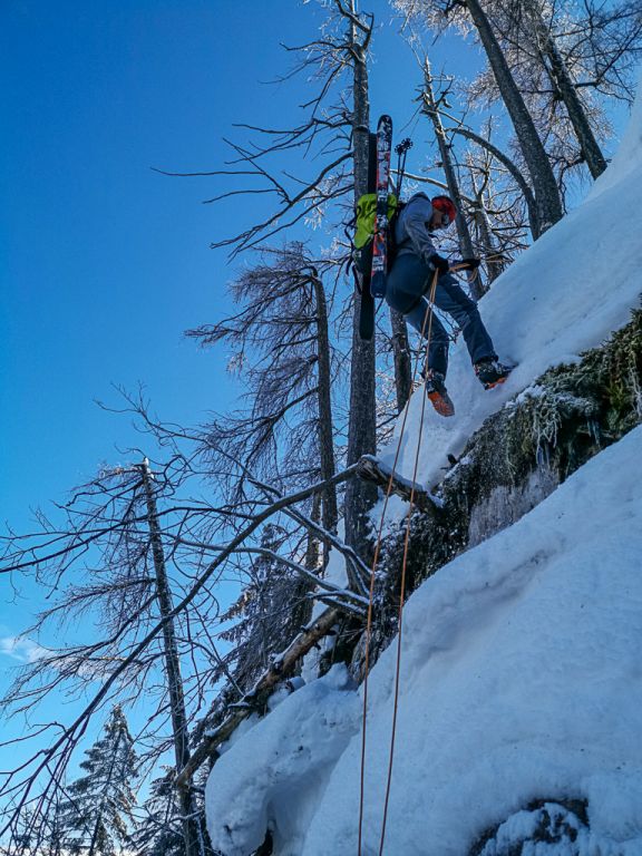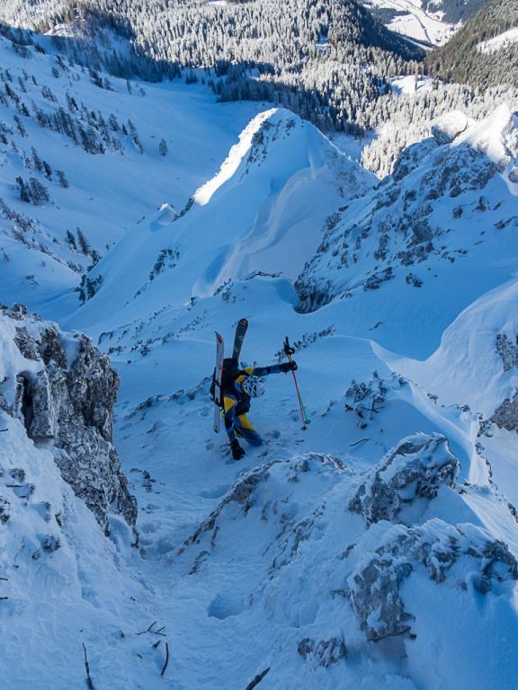 Der Bereich um das Gosaueck und im Speziellen der Abstieg in die Gosaumühle, wird sicherlich nicht oft von Menschen gemacht. Tja, genau das Richtige für unsere Tour. Bereits der Einstieg in den Abstieg ist eine Herausforderung. Immer wieder beenden Felsbänder unsere Skiabfahrt. Diese sind nicht hoch, aber Springen kommt nicht in Frage. Der noch vorhandene Schnee ist teils steinhart und der Auslauf ist nicht wirklich groß und endet 100% mit dem nächsten Sprung über ein Felsband und wenn nicht ein Baum die Reise stoppt, geht das immer so weiter. Mit Sicherheit würde es den Abstieg beschleunigen, aber auch die Tour beenden.