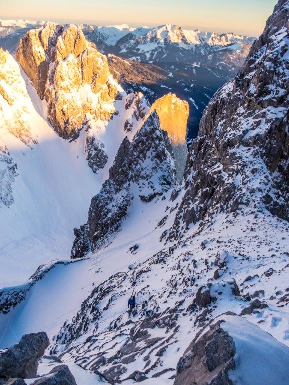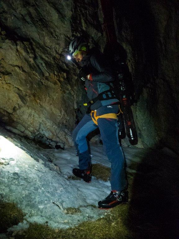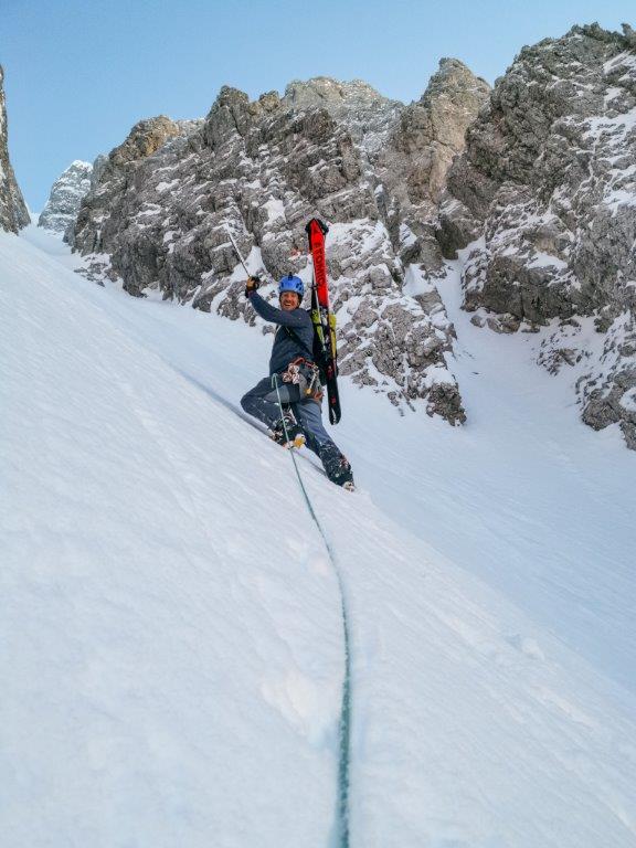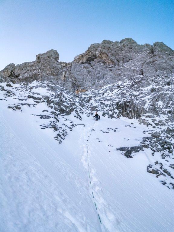 nordöstliche Großwandrinne erreicht. Die Ski werden gegen Eisgerät, Seil