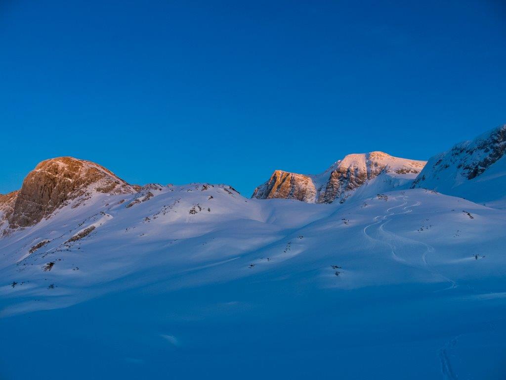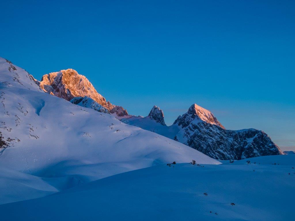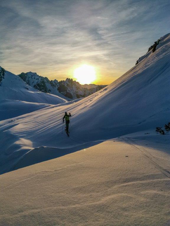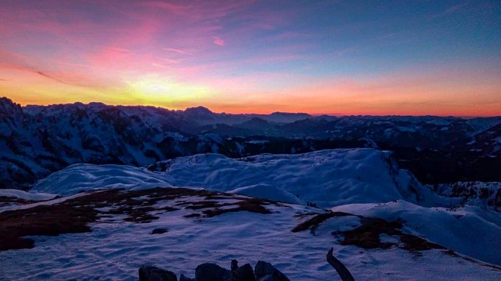 Himmel beginnt sein Farbenspiel. Die Abfahrt vom Hohen Trog im